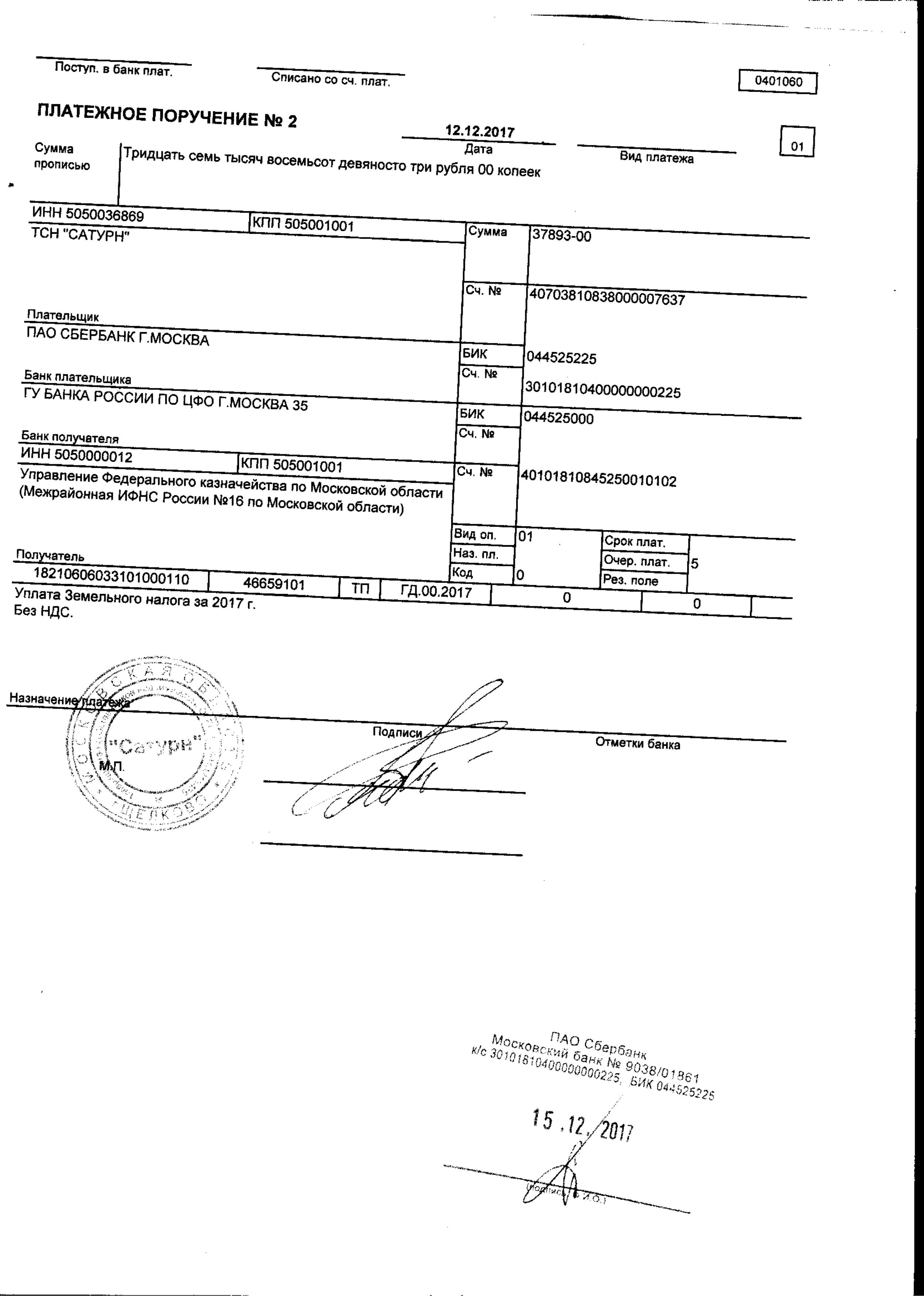 Платеж земельного налога за 2017 г.