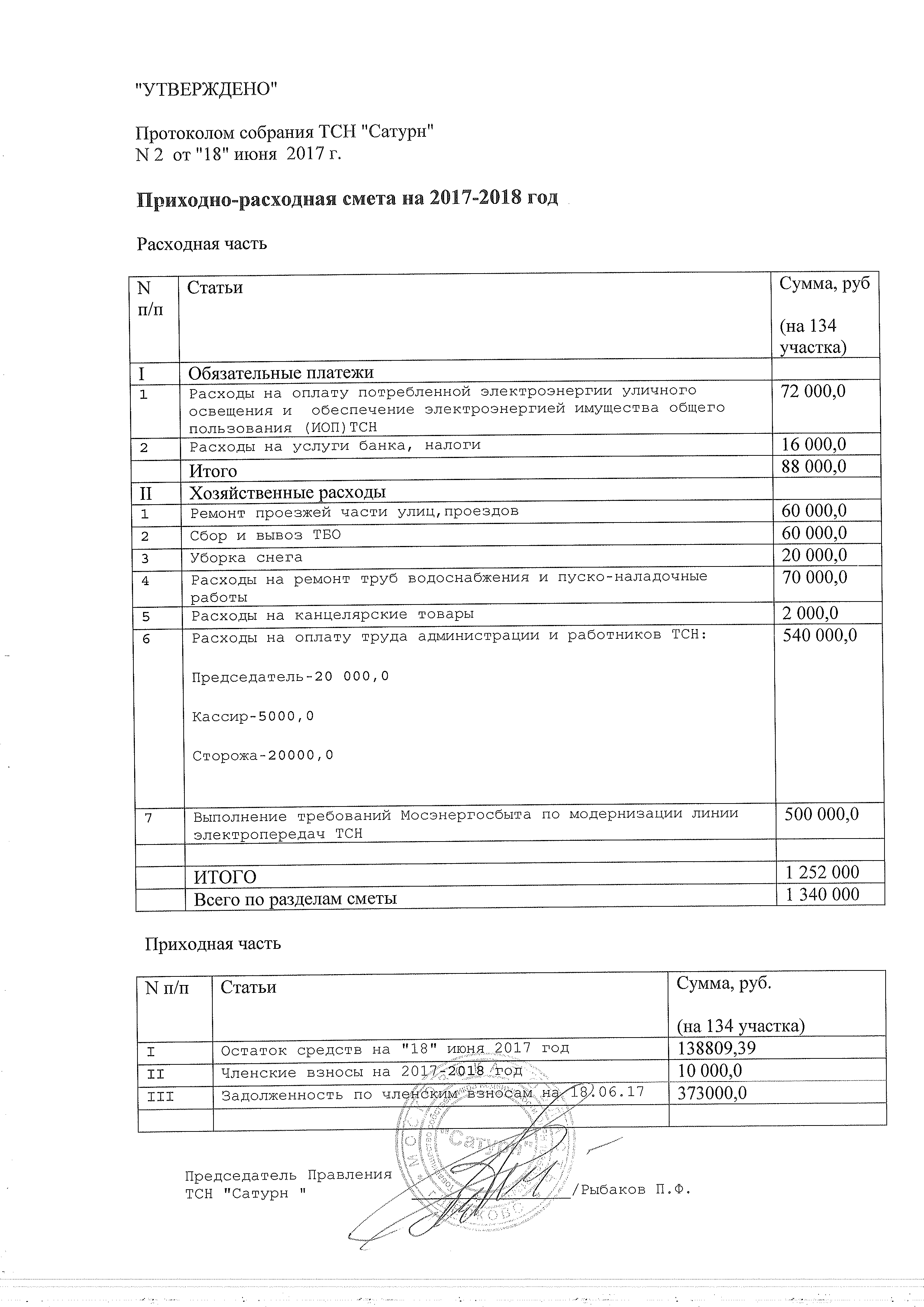 Смета ТСН «Сатурн» за 2017 год